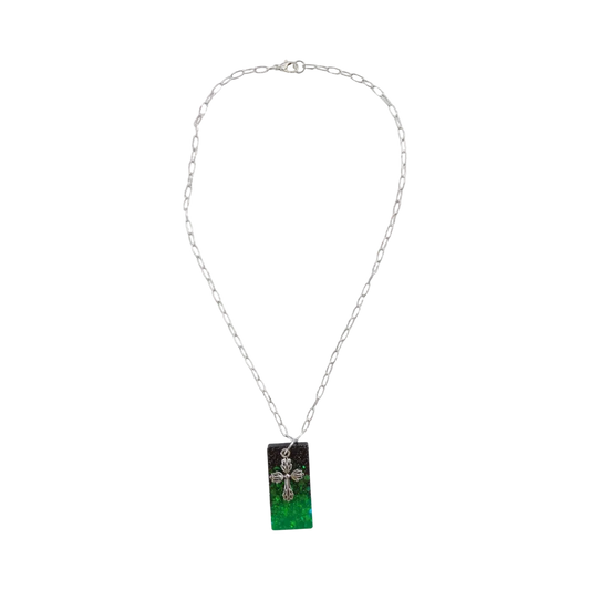 Necklace - 18.5 inches black green glitter resin rectangle with silver cross charm on silver paperclip cable chain