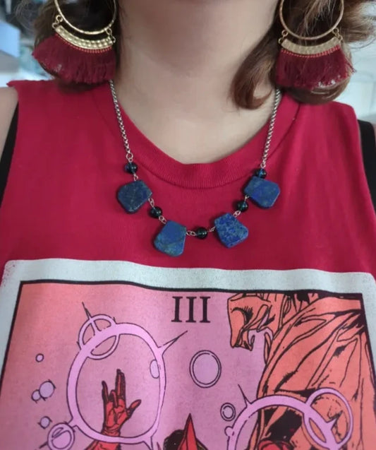 Necklace - 18.5 inches navy lapis and blue glass beads on 3 mm stainless steel rolo chain