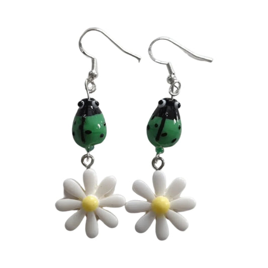 Earrings - Glass lady bug with Paris daisy flower on silver hook
