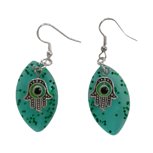 Earrings - Resin leaf shape with hamsa hand colorful evil eye charm on silver hook