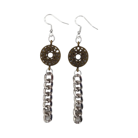 Earrings - antique bronze pendant with silver curb chain on silver hook