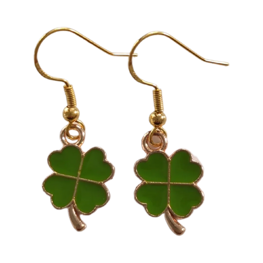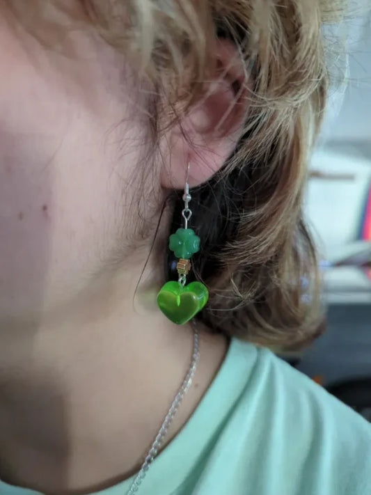 Earrings - Green Shamrock Clover Imitation Jade Glass Beads and 18K Gold Four Leaf Clover Spacer Beads 5x5 mm Metal and green gummy heart on silver hook