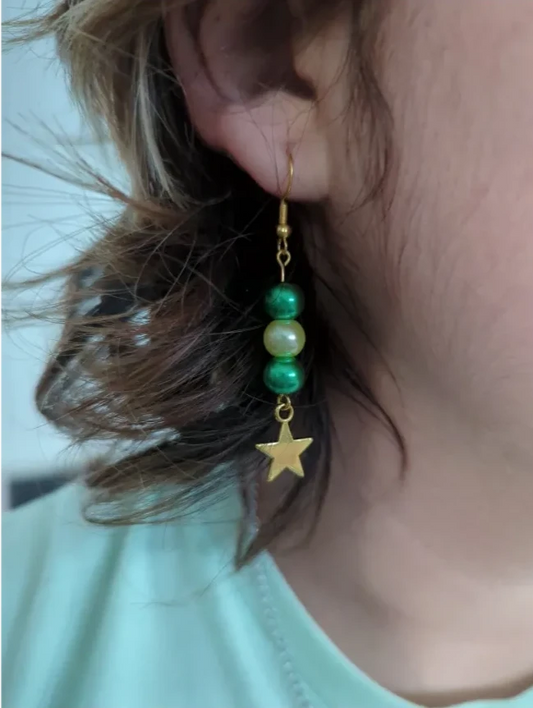 Earrings - Green and yellow pearl beads with gold star on gold hook