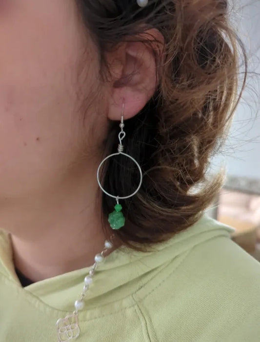 Earrings - Silver hoop with green shamrock clover imitation jade glass beads with green bicone crystal bead on silver hook