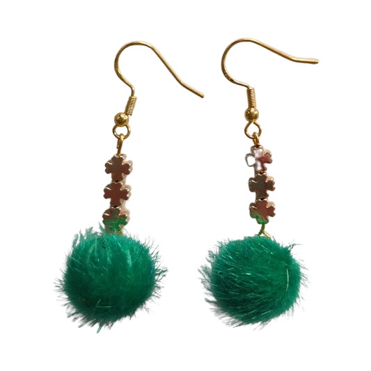 Earrings - 18K Gold Four Leaf Clover Spacer Beads 5x5 mm Metal and green pompom on gold hook