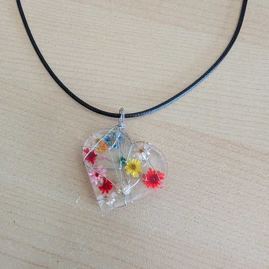 Necklace - 17.5 inches clear resin with dried flowers heart on black cord