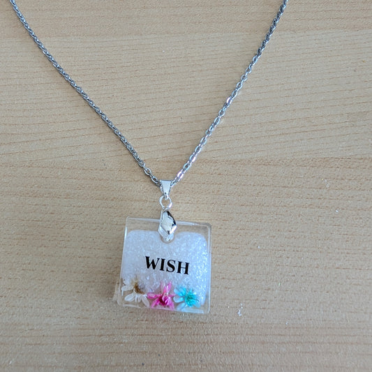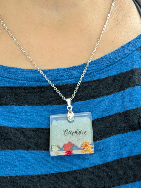 Necklace - 21 inches stainless steel cable link chain with a resin with flowers square pendant