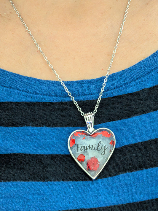 Necklace - 21 inches stainless steel cable link chain with a family resin and flowers silver heart pendant