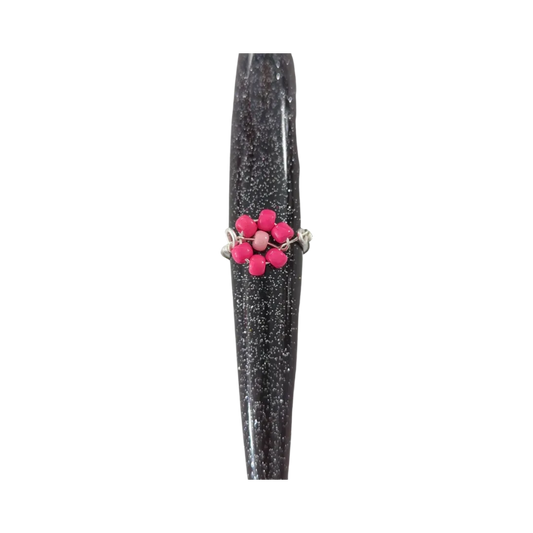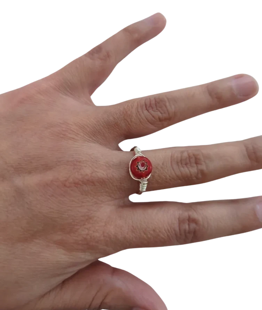 Ring - Glass bead red circle w/flower on silver 22 gauge wire 0.6mm