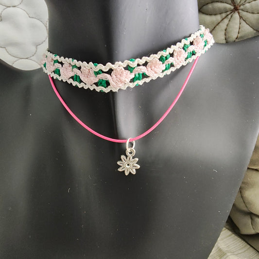 Necklace - Choker pink rose lace with one polyester strand and a flower charm