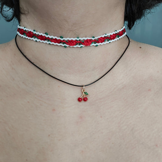 Necklace - Choker red rose lace with one polyester strand and a cherry charm