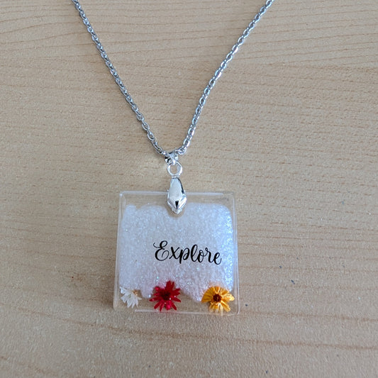 Necklace - 21 inches stainless steel cable link chain with a resin with flowers square pendant