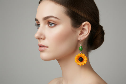 Earrings - Sunflower with green bead on silver hook