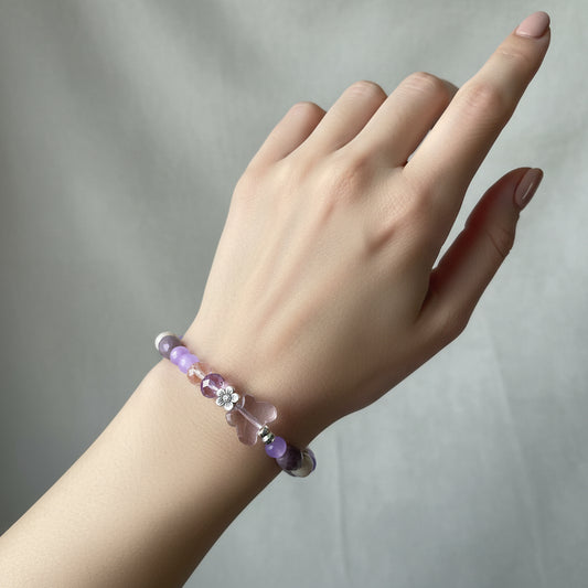 Bracelet - Elastic Crystal butterfly bead with pink and purple beads and flower metal spacer beads