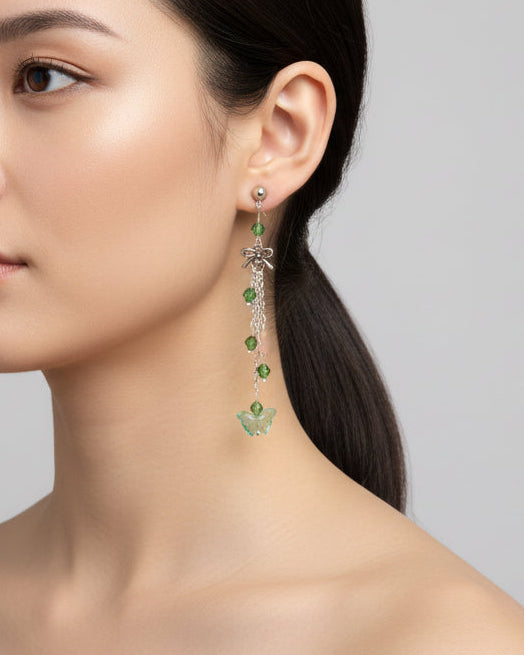 Elevate your everyday style with these enchanting butterfly earrings, featuring delicate silver chains, a charming bow accent, and sparkling crystal beads suspended from classic silver ball post studs. At approximately 3 inches in length, they offer the perfect balance of presence and wearability, making them ideal for both casual outings and special occasions. Weighing just 0.18 oz, these lightweight beauties won't weigh you down, allowing you to wear them comfortably all day long. The intricate design combines timeless elegance with a playful touch, creating a statement piece that celebrates your unique personality and refined taste.
