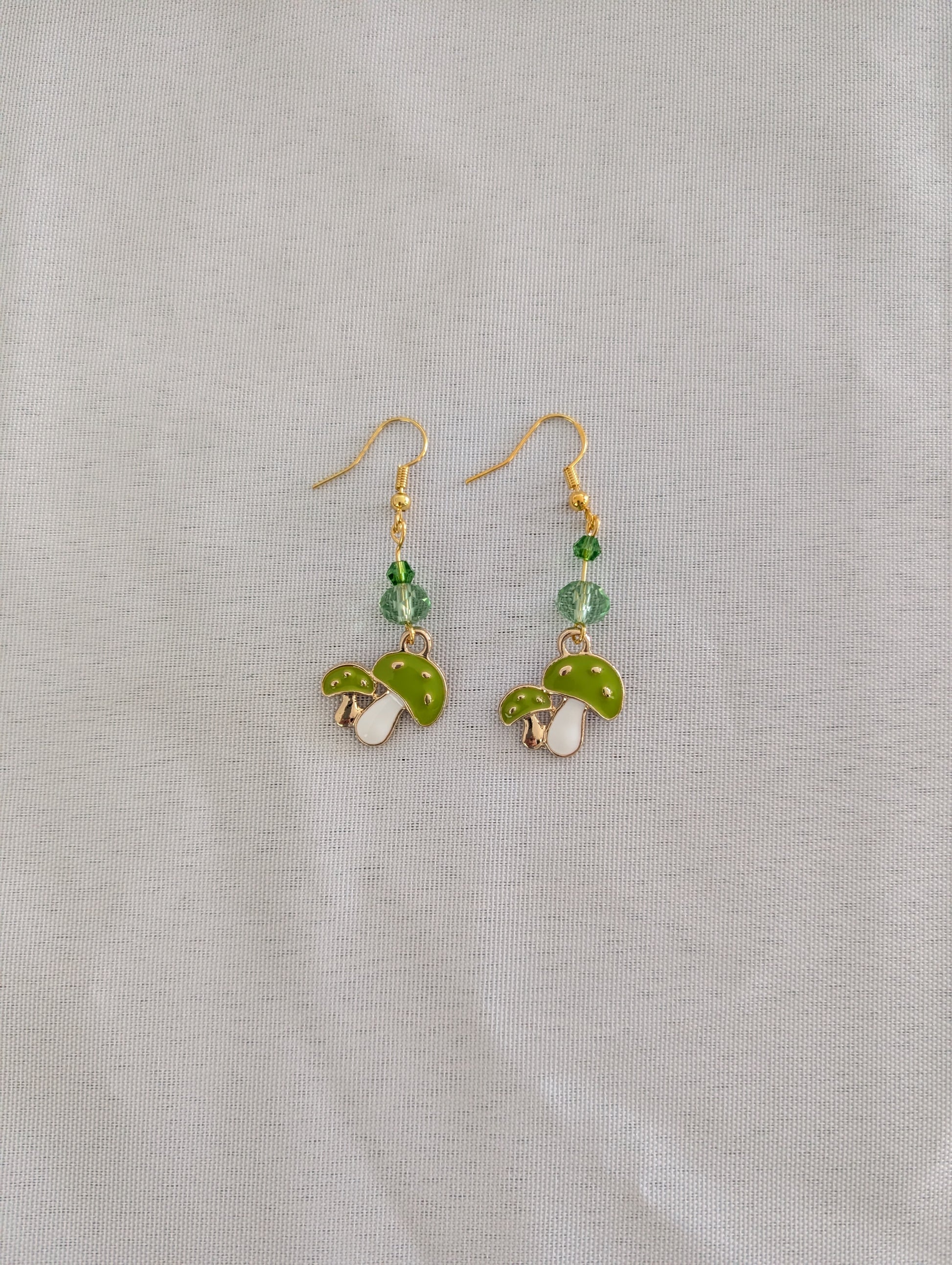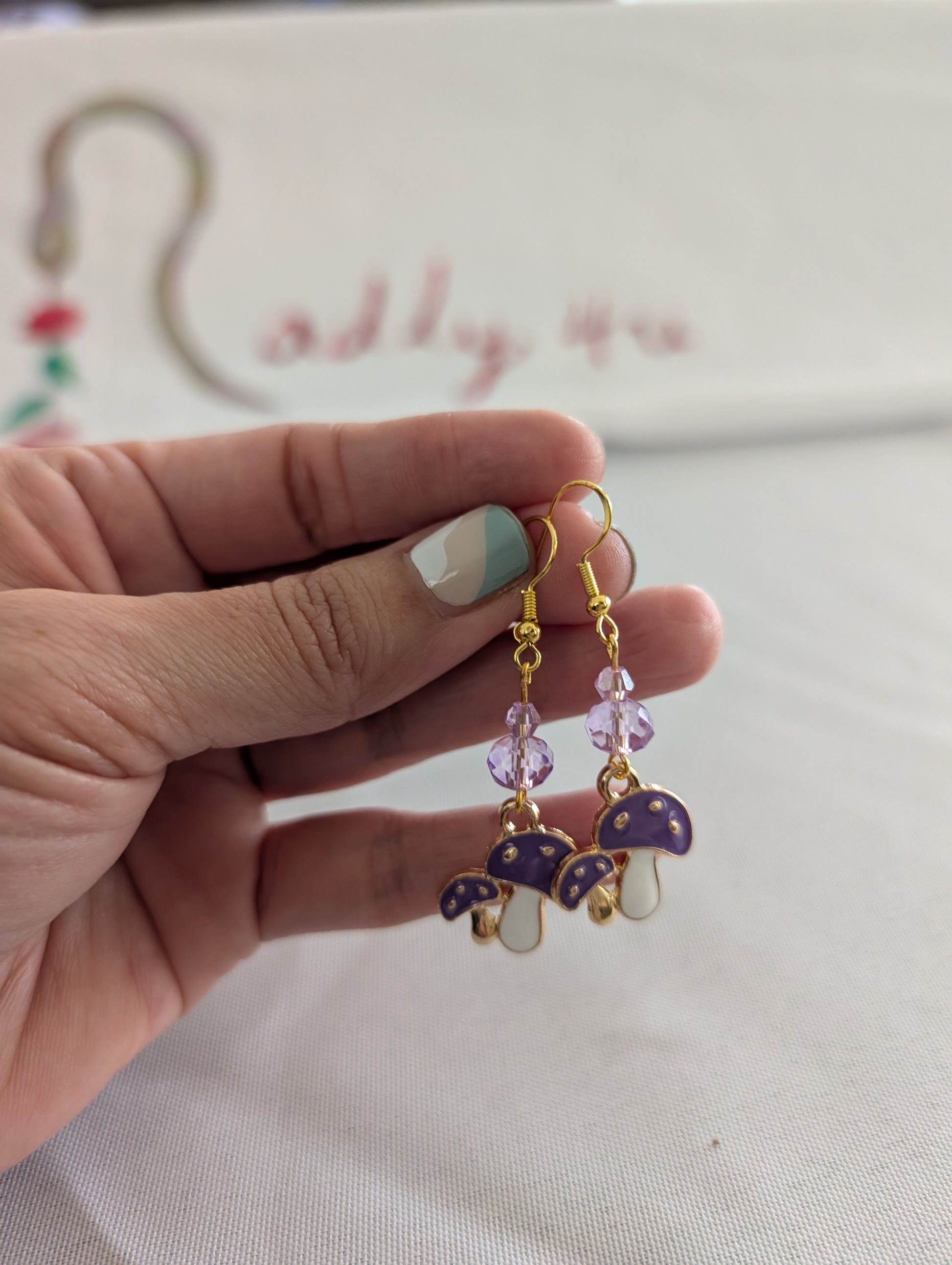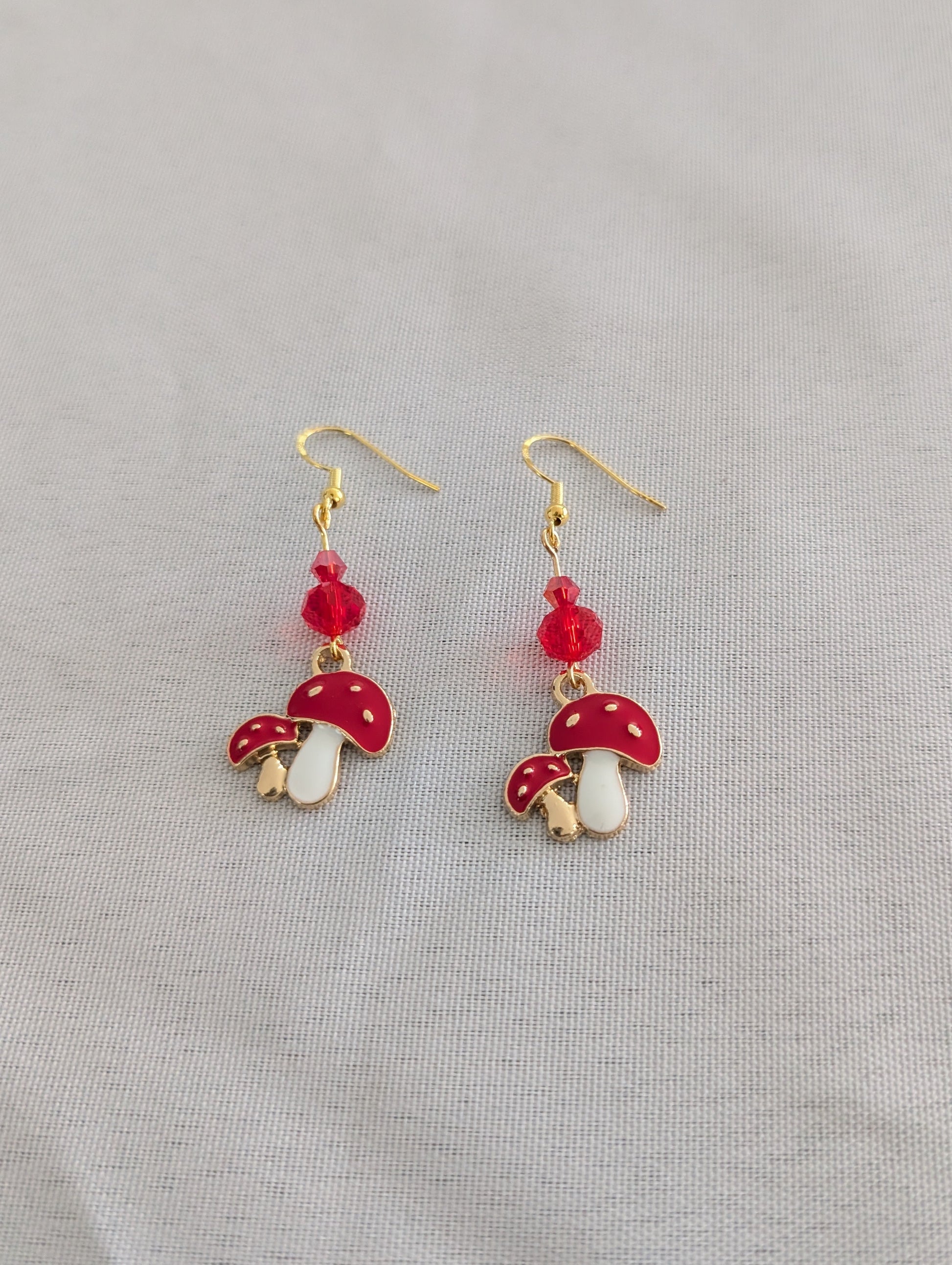Enchanting mushroom earrings featuring delicate crystal beads nestled on lustrous gold plated hooks. Each earring measures approximately 2 inches, striking the perfect balance between statement-making and wearable elegance. At just 0.15 oz per pair, these lightweight beauties won't weigh you down, making them ideal for all-day wear. The shimmering gold plating catches the light beautifully, while the crystal accents add a touch of sparkle and sophistication. Perfect for nature lovers and those seeking unique, whimsical jewelry that stands out from the ordinary.