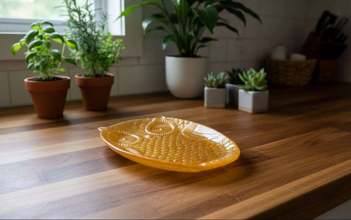 Add a touch of woodland charm and golden warmth to your home with our Handcrafted Resin Owl Trinket Tray. Meticulously hand-poured, this tray features a rich, amber-gold hue with a subtle pearlescent shimmer that glows under natural light. Its detailed texture—from the intricate feathers to the wide, soulful eyes—makes it as much a piece of art as it is a functional organizer.
