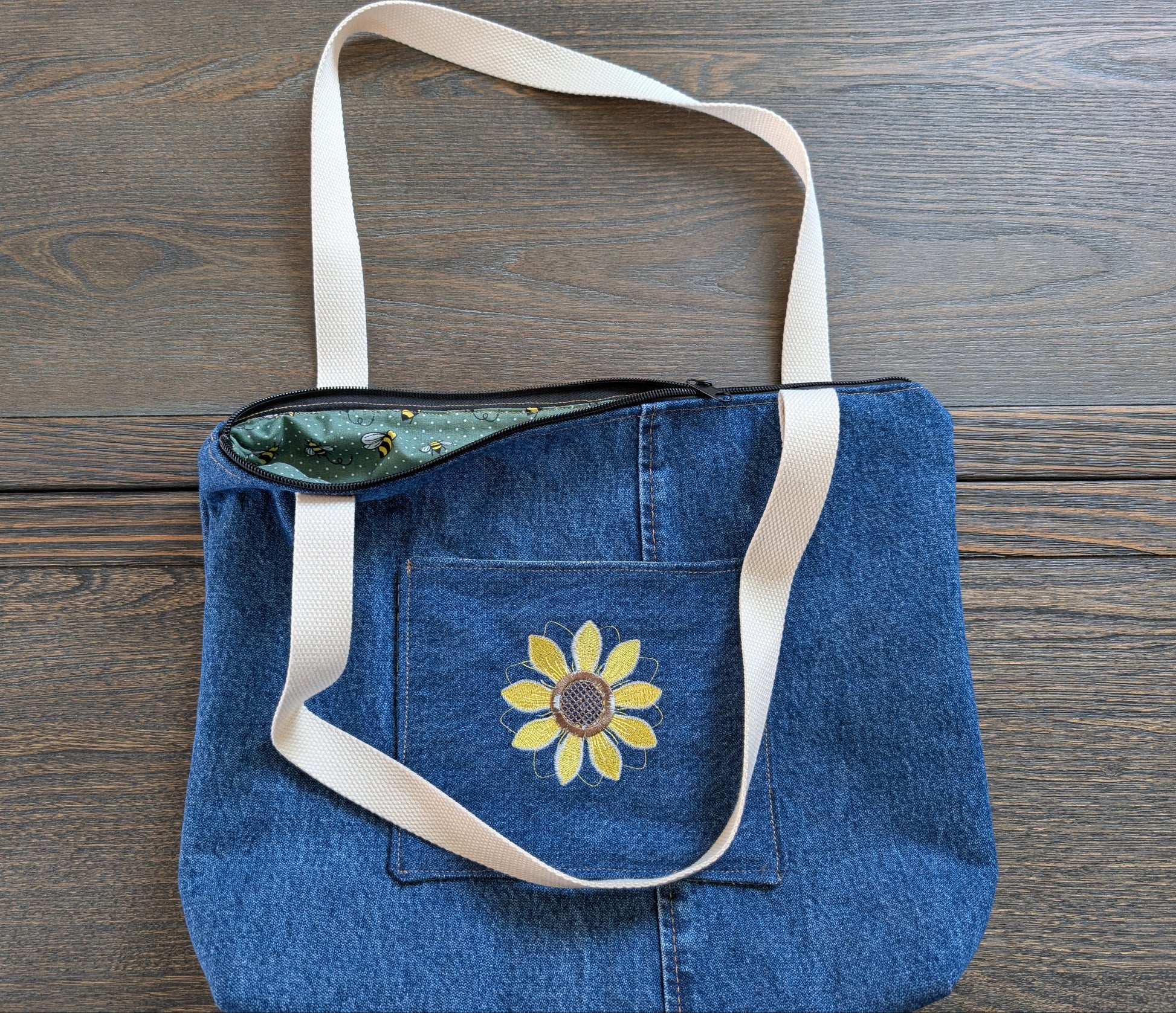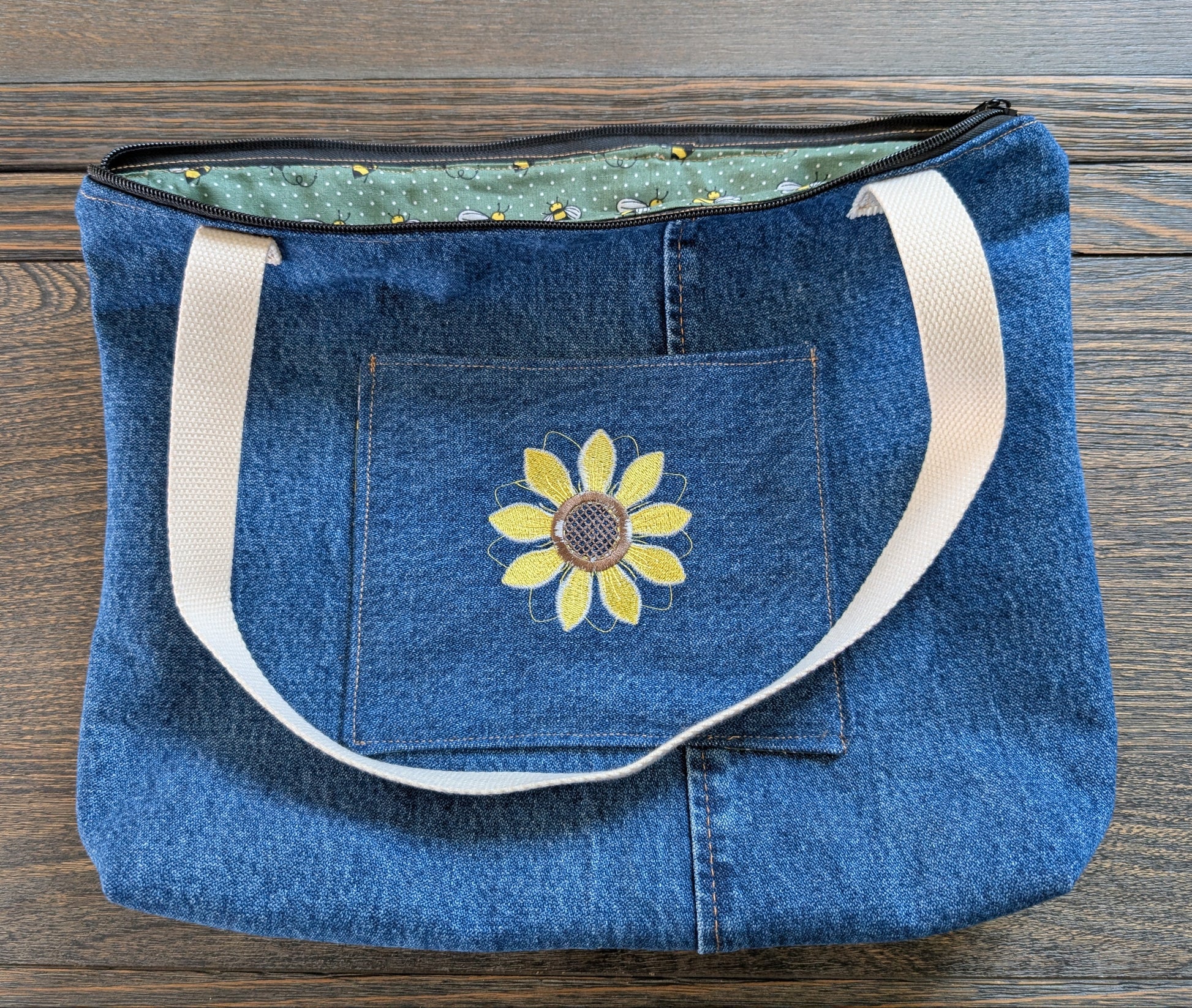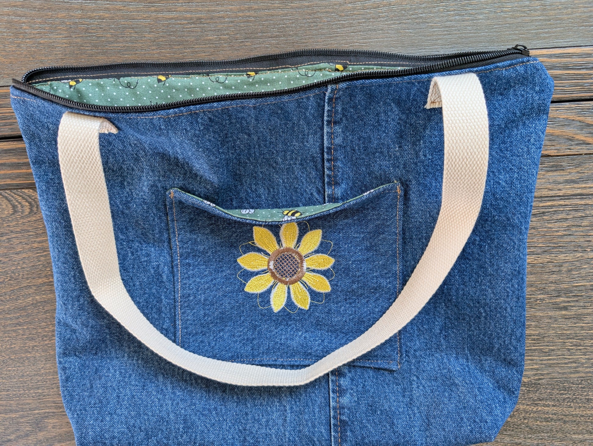 Jean tote bag with bees on green dots lining one outer pocket one inner pocket and zipper closure. The front pocket has a beautiful yellow flower embroidery design.