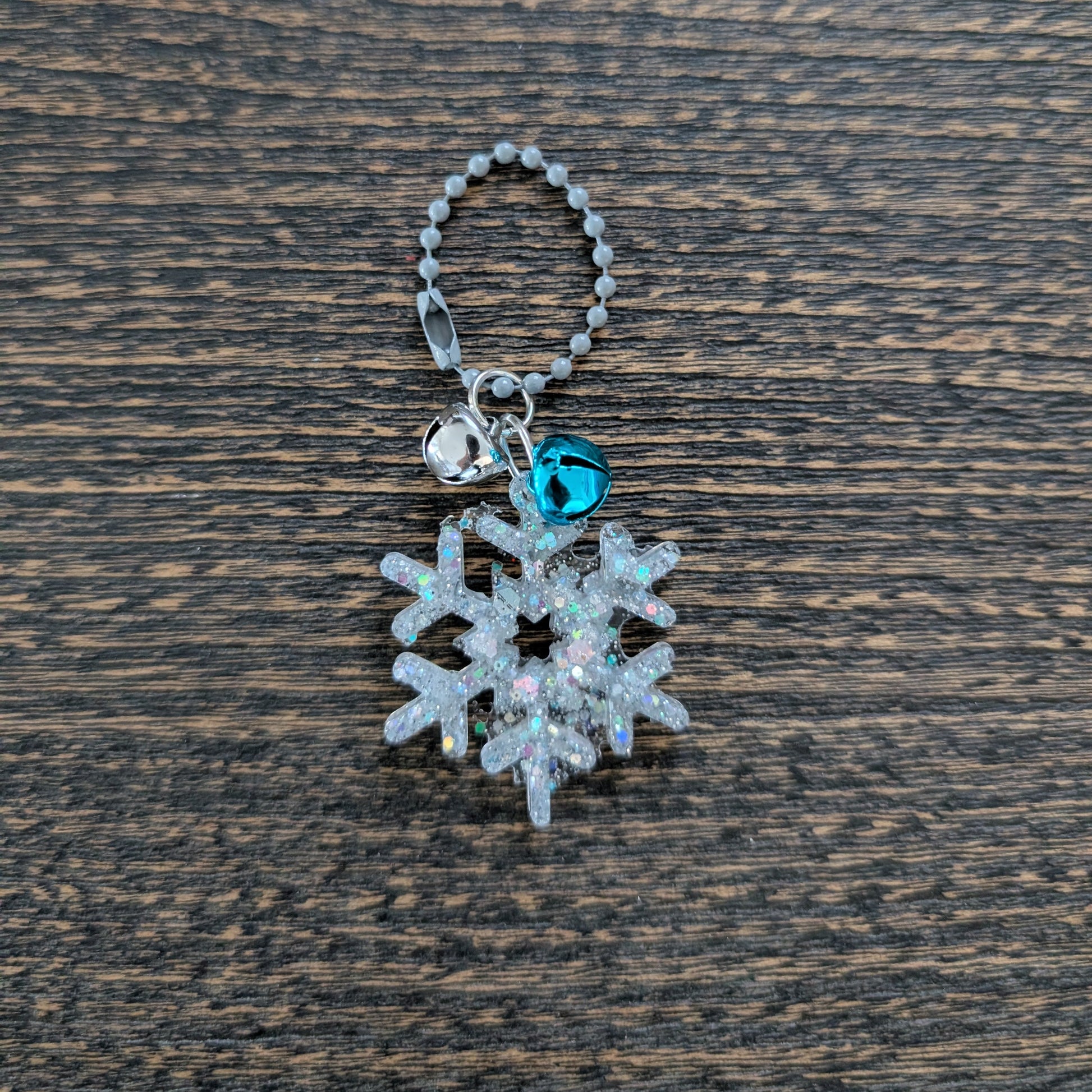 Jingle all the way with this delightful resin snowflake keychain! Featuring charming jingle bells that create a cheerful chime with every movement, this frosty accessory brings winter magic to your everyday carry. At approximately 3.15 inches, it's the perfect size to dangle from your keys, bag, or backpack. Whether you're spreading holiday cheer year-round or looking for a festive gift, this playful snowflake is sure to make heads turn and ears smile.