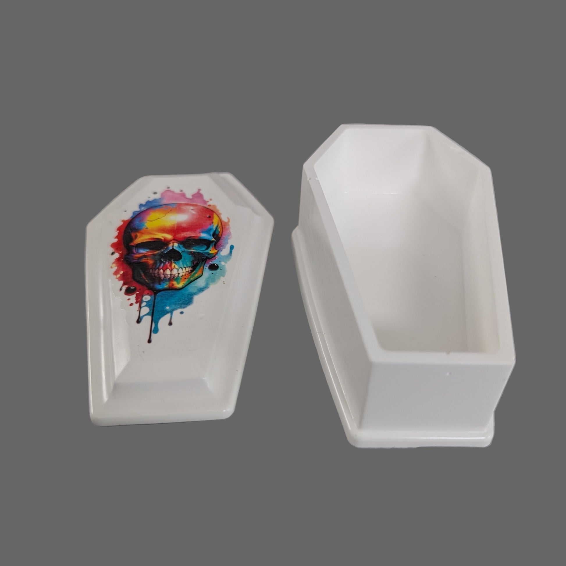 Add a quirky touch to your space with this playful resin coffin trinket box. Measuring about 4.75 x 2.5 inches with a 2-inch height, it’s perfect for storing small treasures or spooky keepsakes. Lightweight at just 7 ounces, this unique box brings a fun, gothic vibe to your décor while keeping your bits and bobs neatly tucked away.
